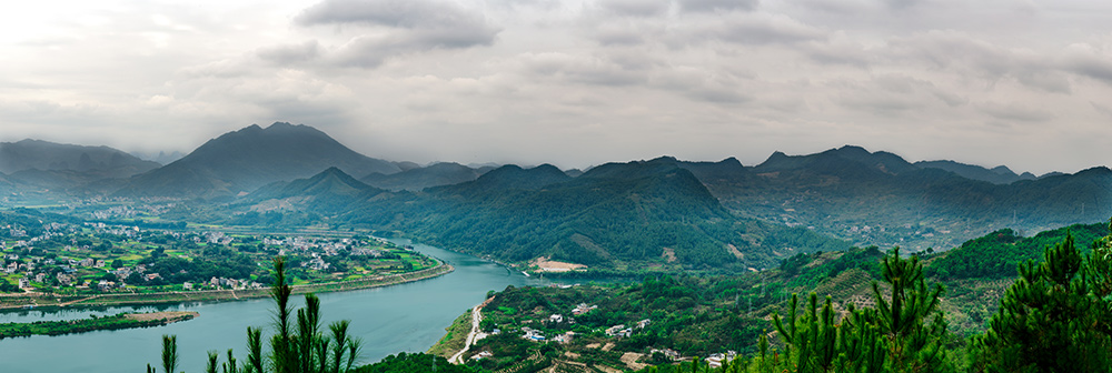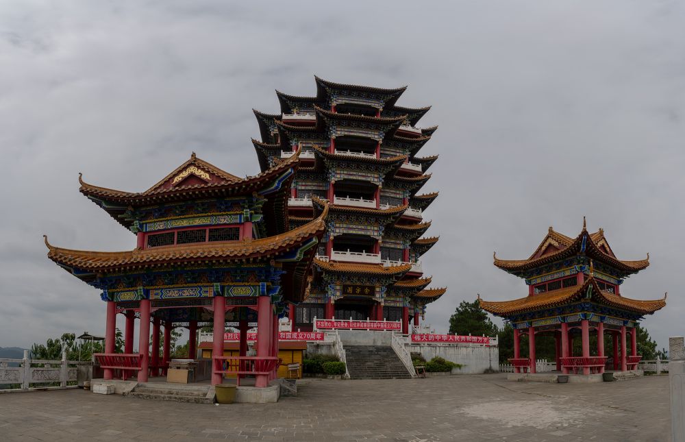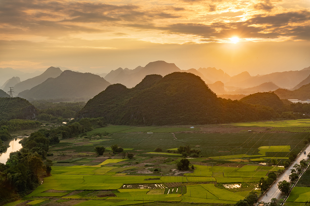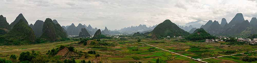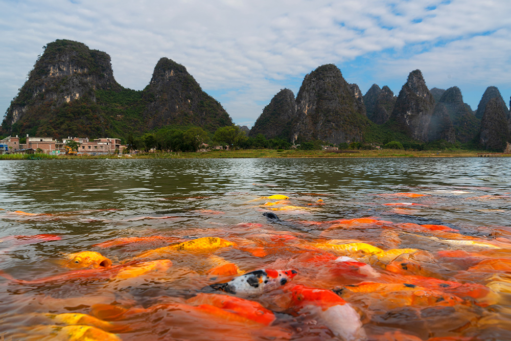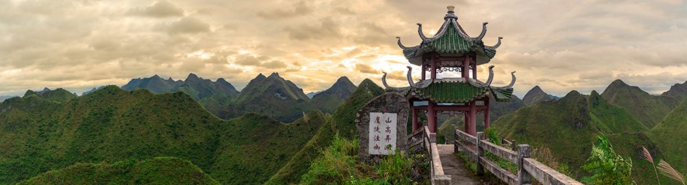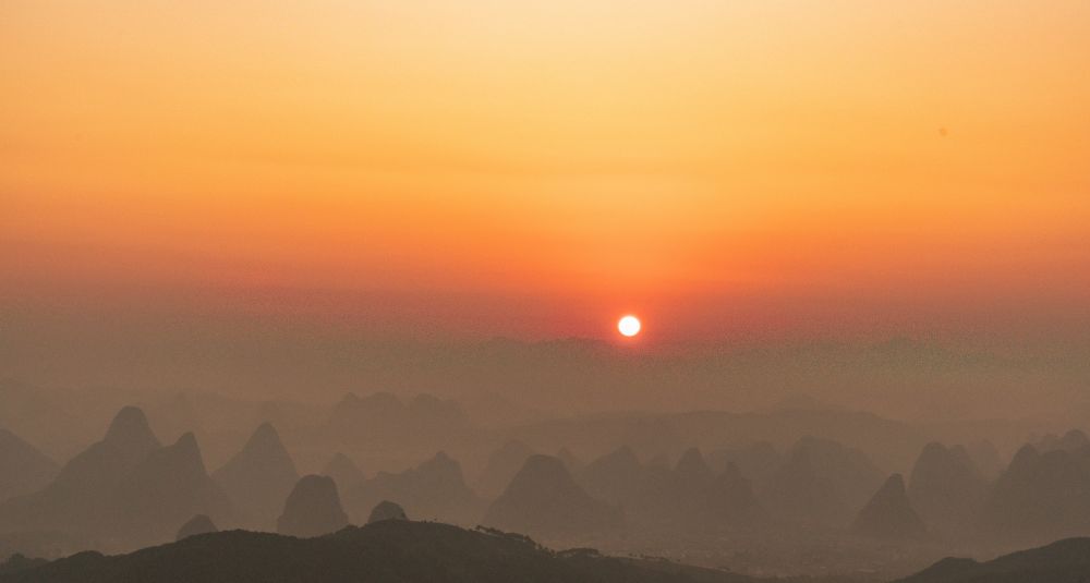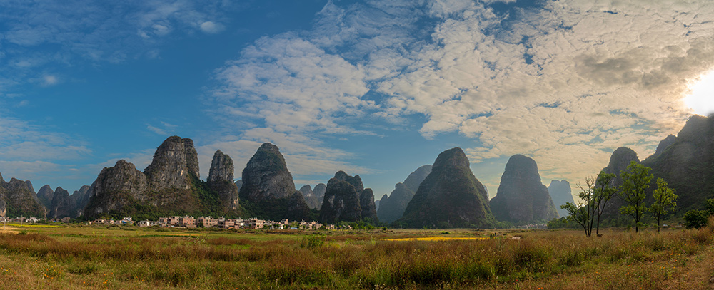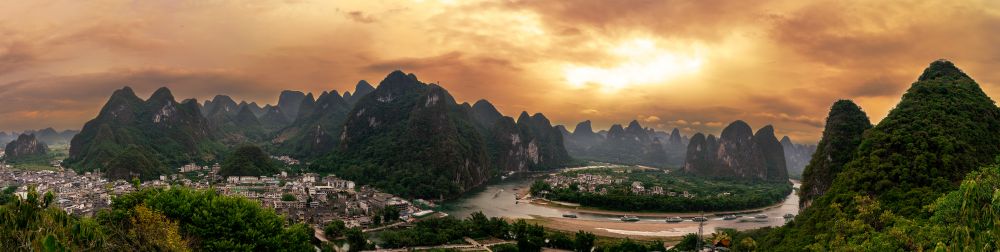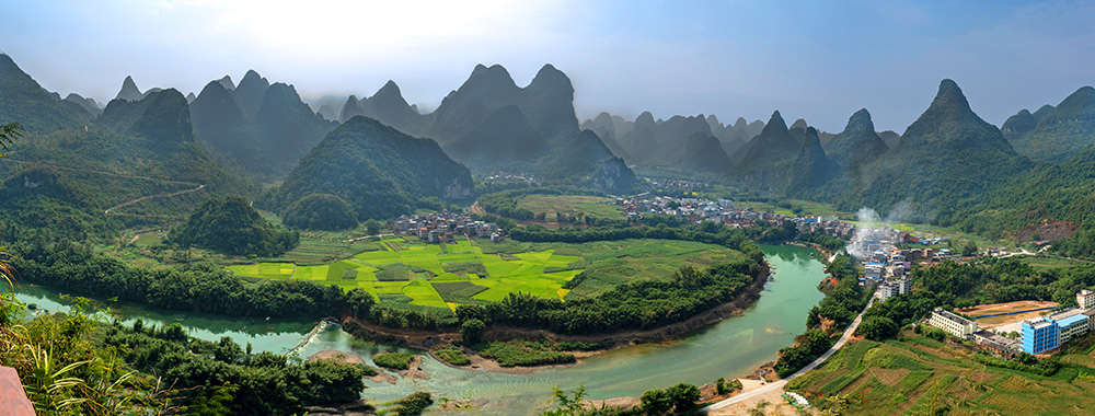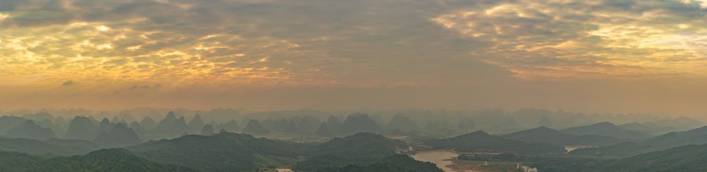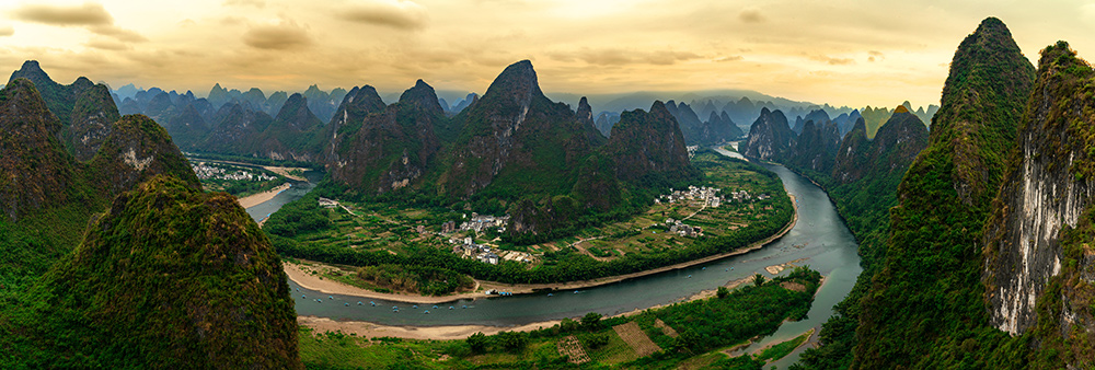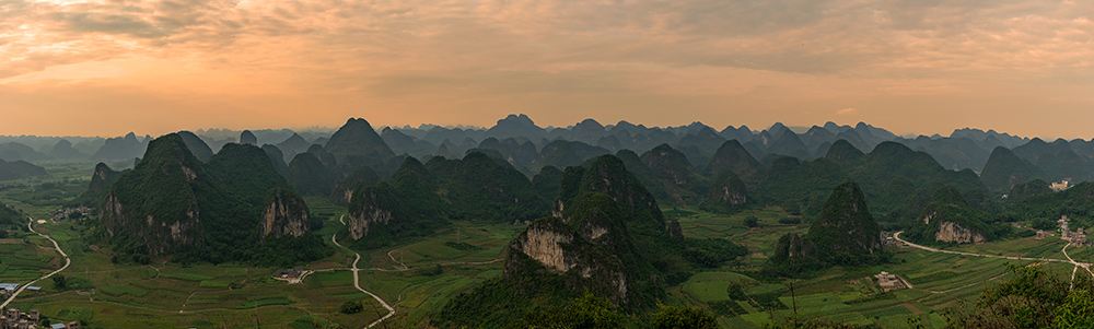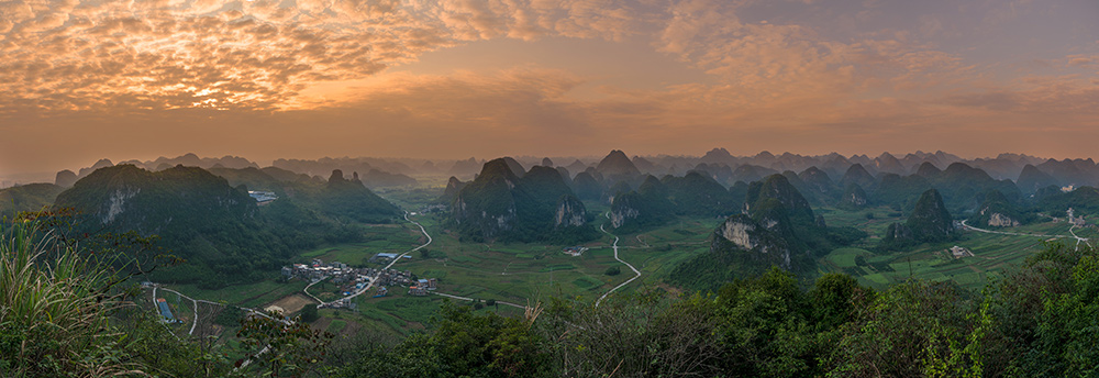 西竺寺位于宜州市北郊的婆岩山,寺庙依山而建,刻佛像于岩,山顶有一尚未完工巨大的亭子式建筑,山上台阶很陡,我们花了近一小时才上山顶,本是拍摄日落的绝佳景点,可惜云层较厚,不过无尽的峰林在透过云层的橘色晚霞下灼灼生辉。登上太极湾能领略到祥贝世外桃源的田园风情,群峰环绕下,一片平旷田野豁然开朗,蜿蜓的祥贝河在田野上流淌出天然的太极图。