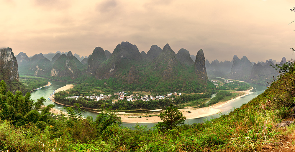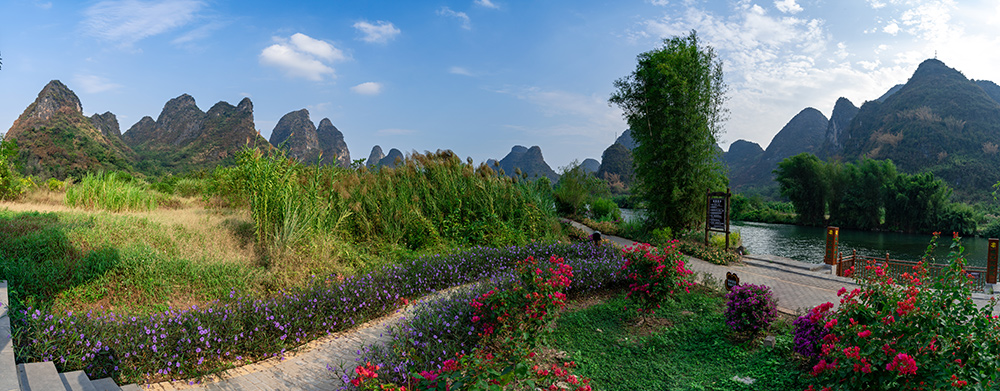 阳朔十里画廊景区无疑是最有名的景点,遇龙河水绿草青,两岸奇峰连绵,一座座充满想象力名字的山峰惟妙惟肖,沿河步道鲜花簇簇,非常美,这本是骑游的佳地,无赖部分人不会骑自行车,我们只步行了从水厄底码头到骥马码头一段。富里桥一般人也多,乌龙泉是一小山头,虽不高但无路,全在乱石和灌木中爬行,毕竟山不够高,风景一般。大众的相公山还是不错的景点,登高远眺,如林的峰丛和在群峰间蜿蜒流淌的漓江美景尽收眼底。