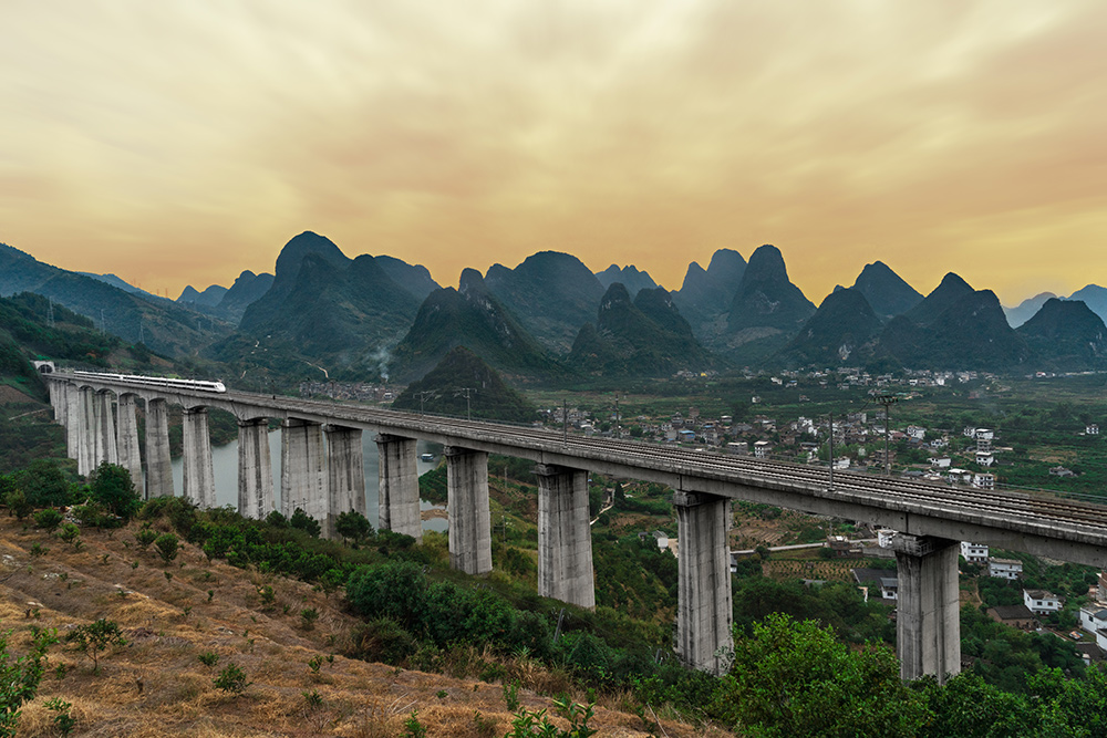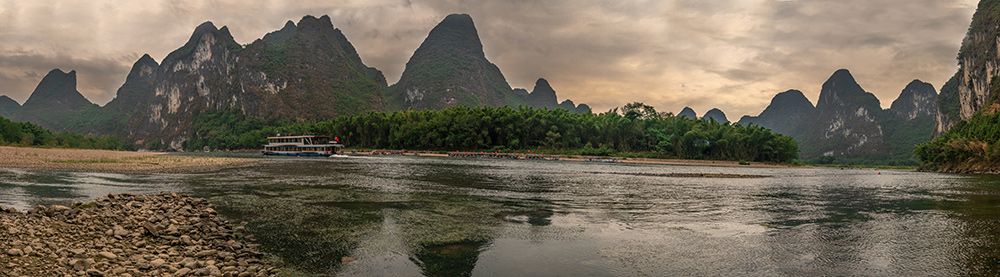 一直有“阳朔山水甲桂林,阳朔美景在兴坪”一说,我们在兴坪住三夜,从东西二面,两上小河背山观20元人民币背面风景-元宝山;兴坪西北的望江岭,山不高,往返不到3公里,但很陡,几乎没有游客,风景无敌,侧面垂直的峭壁为九马画山,山下是蜿蜒的漓江在进入兴坪前的第一个180度弯,弯处群峰林立,一艘艘游船如列队般在漓江上穿梭,真可谓“船行碧波上,人在画中游”。最后一天下午,由当地摄影导游带领去拍高铁高架桥,这是个难度较大的山坡,只有550米长,但拔高75米,走的还很急,大家累的气喘吁吁,但绝对值得,天气也不错,大家收获不少。