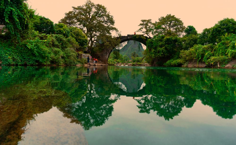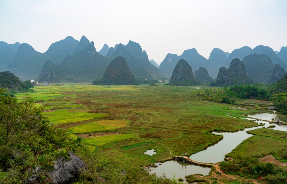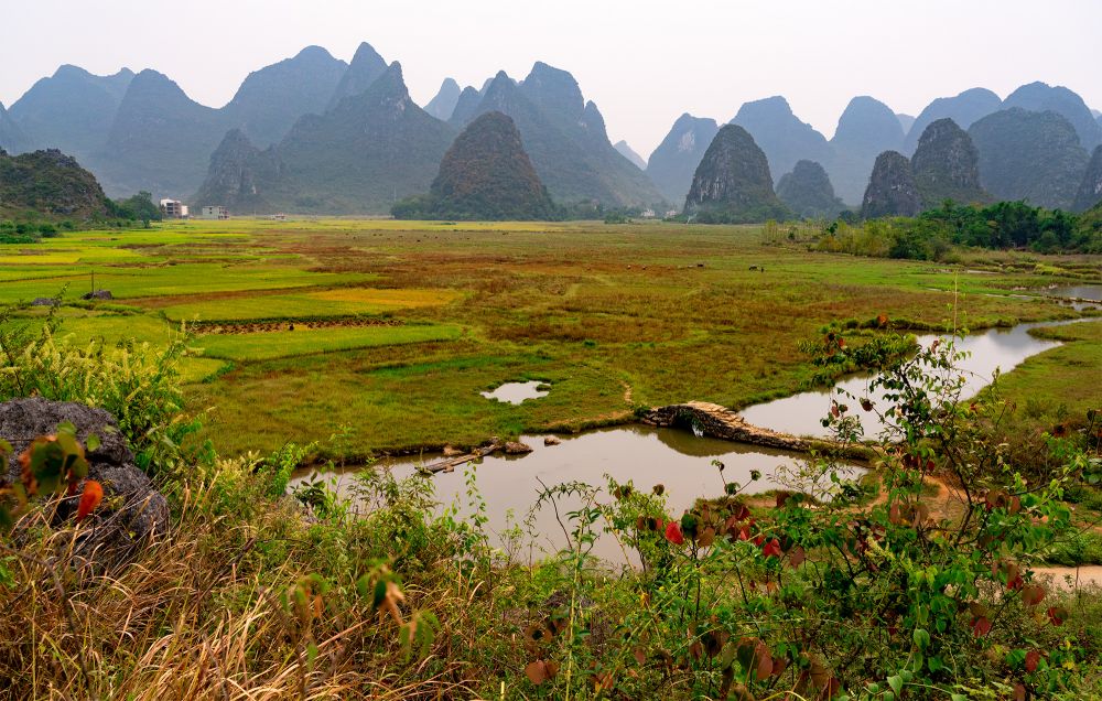 桂林南面临桂区田心村,四面环山,田间池塘上小桥(状元桥),一片桃源景色。