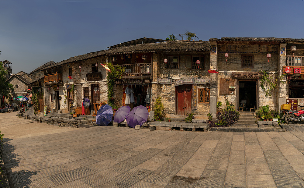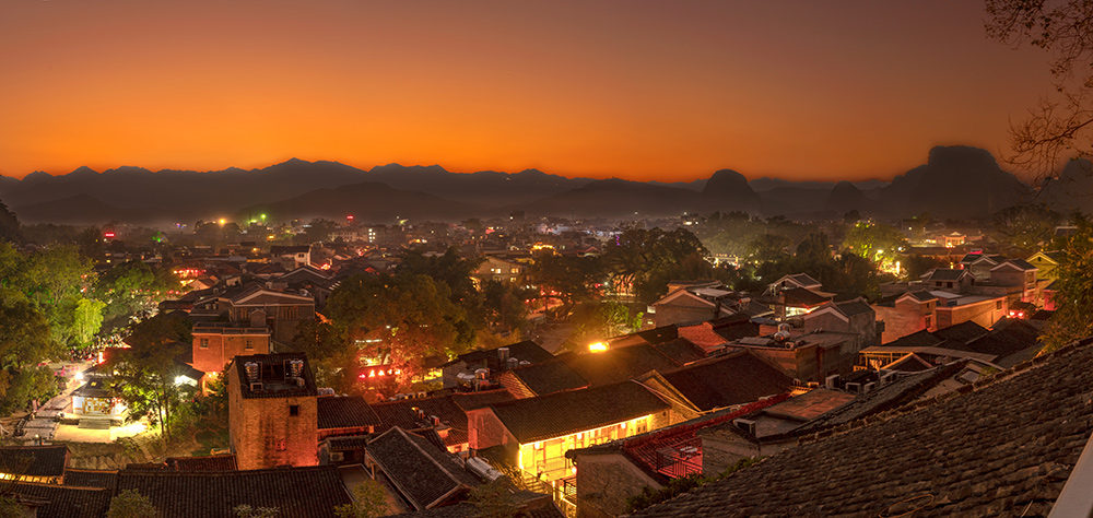 从阳朔经平乐去黄姚,一路石梯登上平乐金字岭,拔高400多米,花了半小时,非常辛苦,可观平乐三江(漓江、荔江、茶江)汇流的山水风景,和彩绘鲜艳、建筑宏大的金子阁,还是值得的。接着到钟山百里水墨画廊,本来自然风景,已成了可乘坐电动车游览的人造公园,不过池中如潮水般涌上岸的锦鲤太漂亮了,印象深刻。出来后已经下午4点过,Tony还不过瘾,又带领大家爬上百里水墨画廊旁不知名山上拍日落,下山6:30, 天已黑了,在漆黑的723县级路上一摇二晃到晚上8点才到东潭岭客栈。贺州黄姚东潭岭客栈坐落于黄姚古镇西北,海拔630米,客栈为两层的原木建筑,虽比较简陋,但可鸟瞰整个黄姚古镇,晨观日出,夜赏明月,云雾缭绕,如梦幻仙境。夜宿两晚,大家拍照非常尽兴。