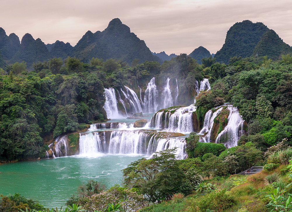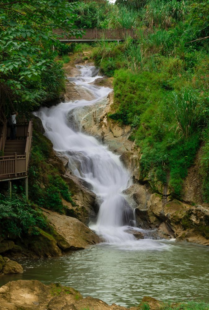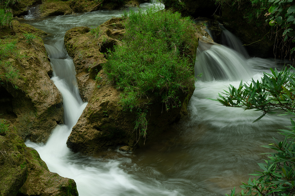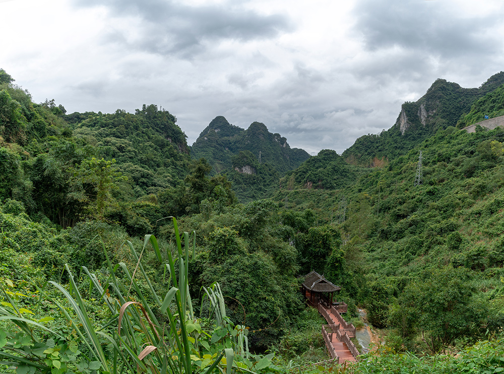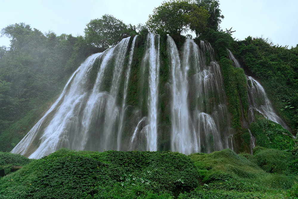 离靖西只有30多公里的古龙山大峡谷,如绿海密林,峡谷幽深,绿树婆娑,从120多米凌空飞泻的古劳瀑布,经过溶洞暗河,沿着黑水河,是一条近5公里的步道,随处可见飞瀑流水,有的飞流直下,气势恢宏;有的层层叠叠,如妙曼水帘;也有平缓延绵,如波光粼粼的滩涂,这一路简直就是大大小小瀑布的盛宴。