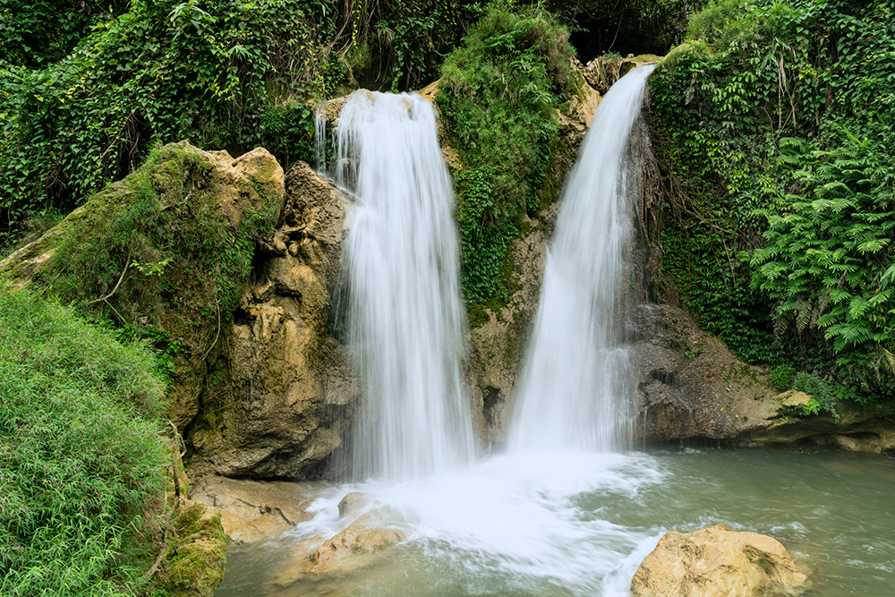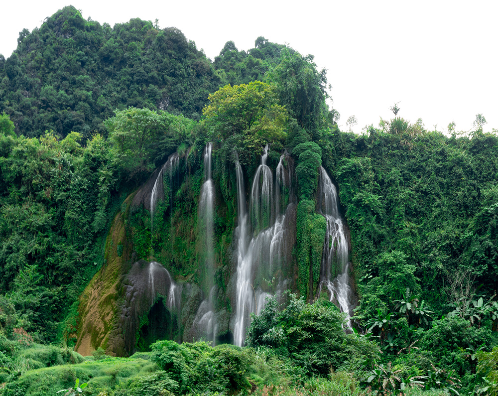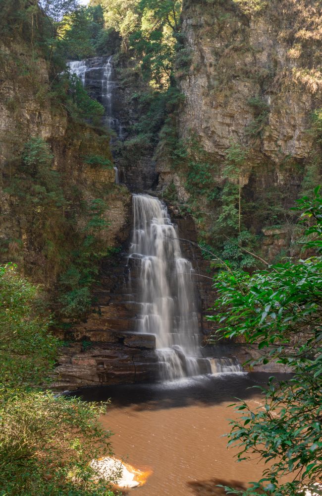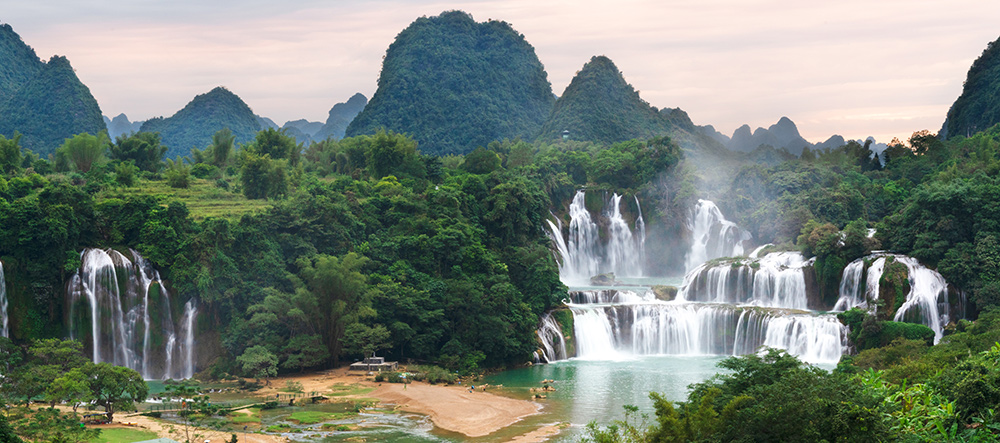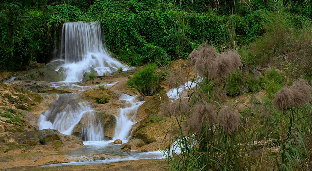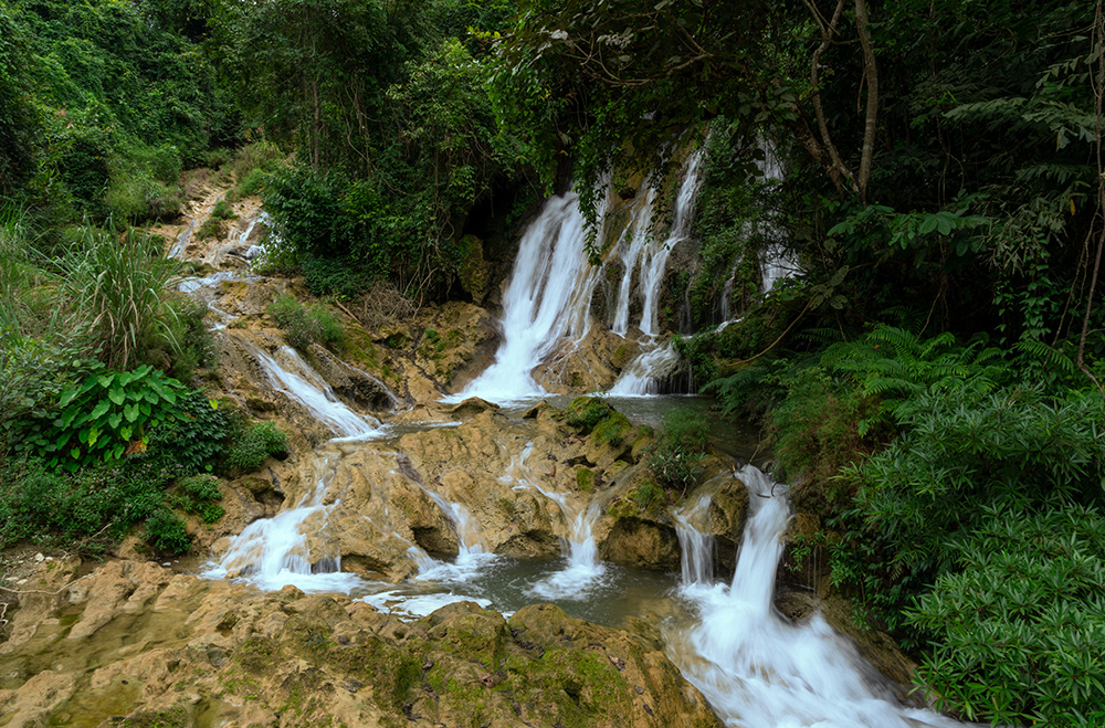 离靖西只有30多公里的古龙山大峡谷,如绿海密林,峡谷幽深,绿树婆娑,从120多米凌空飞泻的古劳瀑布,经过溶洞暗河,沿着黑水河,是一条近5公里的步道,随处可见飞瀑流水,有的飞流直下,气势恢宏;有的层层叠叠,如妙曼水帘;也有平缓延绵,如波光粼粼的滩涂,这一路简直就是大大小小瀑布的盛宴。