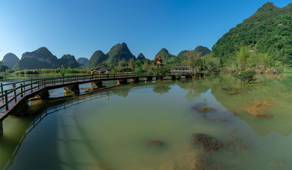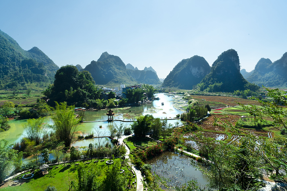 我们坐船进入靖西鹅泉景区,景区不大,有山有水,池中亭阁,荷叶浮桥,风景秀美,尤其登上观景台,更是群山如屏,碧水绿田,一排宁静晏如的田园画卷。