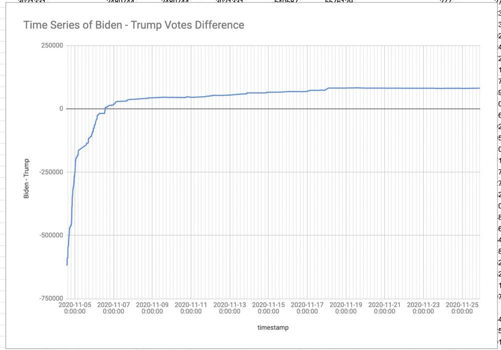 其次呢,好在GitHub保存了宾州投票的完整时间序列. 把数据抓下来,用Excel 简单做个图,就能看到11/4开始计票时拜登落后川普-618,840票. 落后大概-570,000票的时间大概在下午3:20左右.