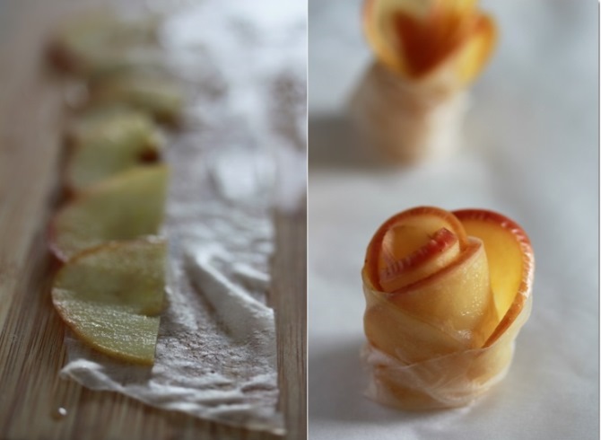 原打算做红绿色的玫瑰。可惜家里的绿苹果都吃完啦。苹果分半去核,这时看你的刀工啦, 切的越薄越好。用糖浸上苹果片,这样可能保持苹果的颜色。