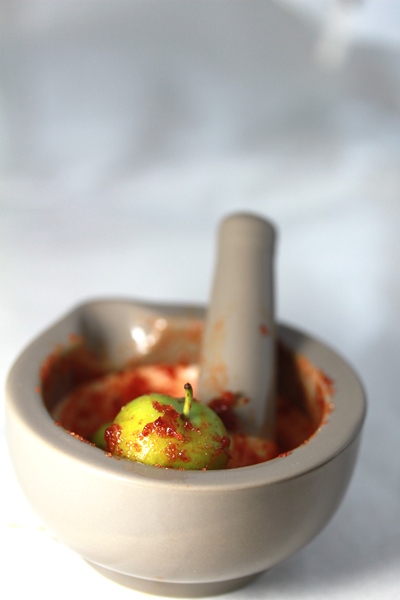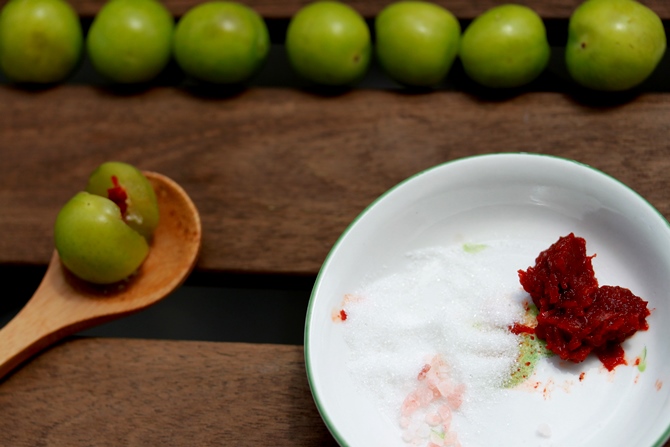 回家以后马上试试青梅沾盐,味道很清爽,我觉得这样吃很单调,我一下联想起我在泰国吃过的街头小吃番石榴。泰国吃番石榴的味道是酸酸甜甜脆脆还有撩人舌尖的辣,外加番石榴的甘甜,条件反射口水。。。看我这点出息,哈哈。又看了一下番石榴的片片,怎样做青梅心里也有数啦。