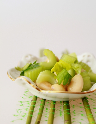 芹菜洗干净用开水沥一下。控去水分的芹菜和杏仁一起和盐搅拌均匀。然后放入无油的密封容器里,放冰箱两天就可以开吃了,很爽口清淡的小菜。