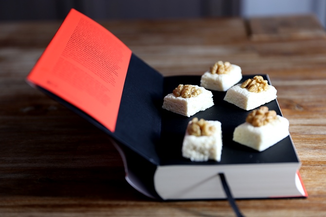 等糖温手时,可以捏成椰球,在椰子方块上按上核桃
