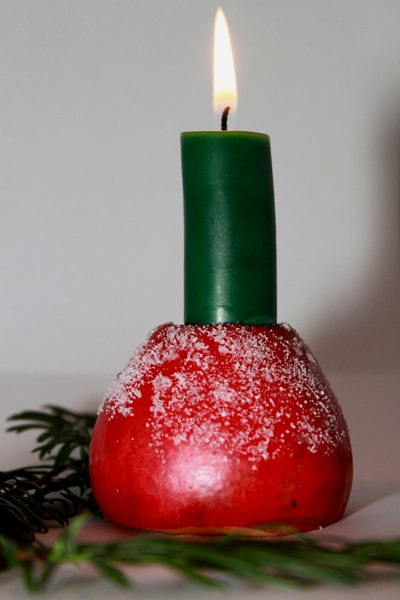 苹果蜡烛的做法也简单,挖个可以放蜡烛的洞,用水冲一下苹果,不搽干粘上一层糖粒,挂雪霜的圣诞蜡烛就做成啦。可惜今年没有时间玩。这两个都是以前自己玩的。