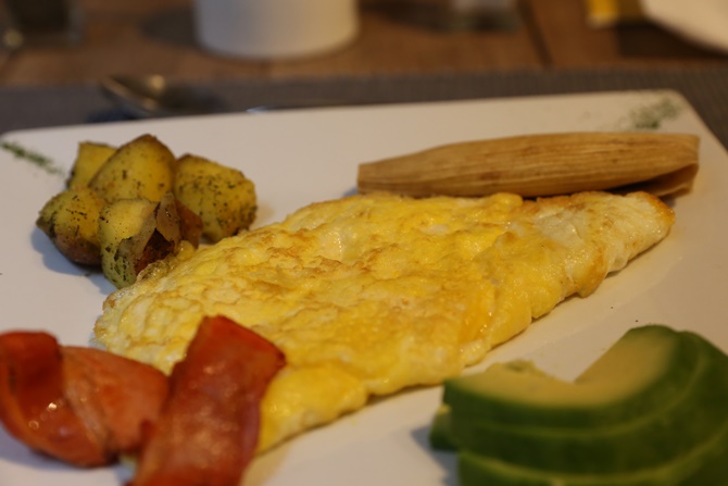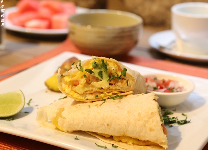 我接连两天的早餐就是它了,其实这煎饼果子是再普通不过的食材,也不会增加酒店的消费。可很多时候就是少了那份用心。秘鲁的煎饼果子 是薄饼上摊鸡蛋,加了牛油果,番茄和欧芹,还有奶酪。我点的时候特意说不要奶酪。