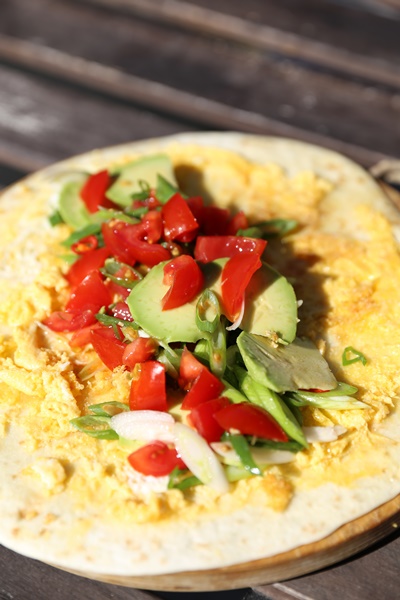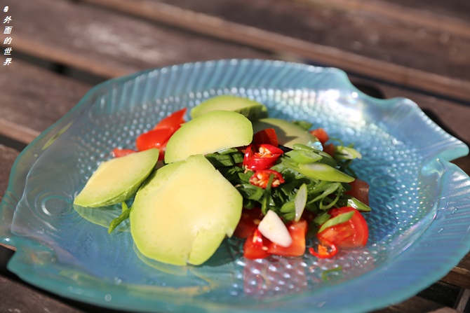 这是山寨的秘鲁煎饼果子 ,用了牛油果,番茄,小葱和香菜, 当然好吃是因为刚出炉的鸡蛋煎饼