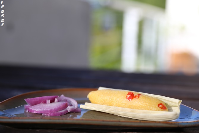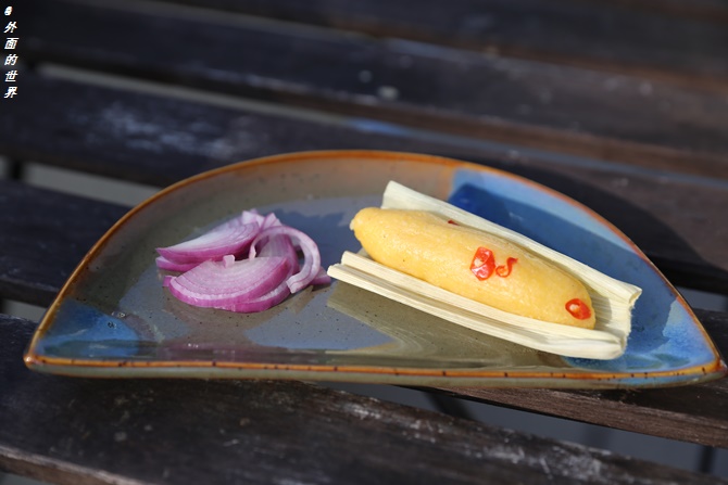 玉米糍粑上蒸锅蒸熟,配上紫洋葱,洋葱上浇几滴新鲜的青柠檬汁,非常清爽美味