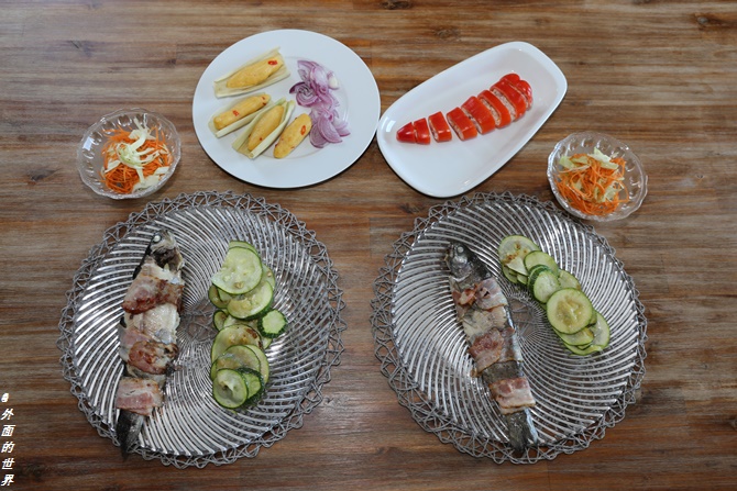 鳟鱼肚事先抹盐,然后放入蒜头和姜片,把鳟鱼用培根缠上