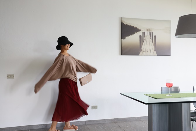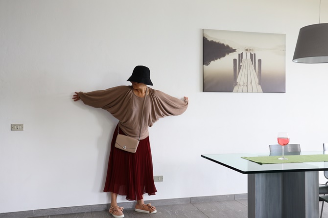 红色百褶裙,今年网购的蝙蝠衫,还没穿过,意大利太热也用不上