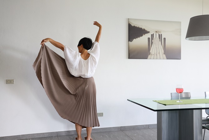 ZARA家百褶裙,白菜价买的,这裙子不讲究质地,因为不是化纤根本出不来这个效果,大牌百褶裙讲究点里面有一个衬裙,我看了几个衬裙也是化纤的,多此一举。