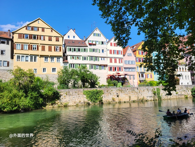 可以徒步走街逛巷,也可以乘船游览,这是小城独特的平底船(Stocherkahn), 游人相对而坐。