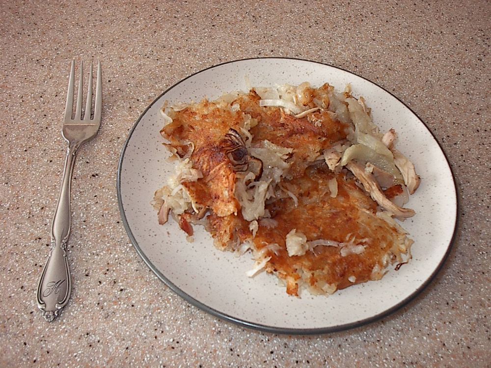 今天早上,圆在厨房团团转,不知道早餐该做啥。问D,D建议:Turkey Hash Brown。我一拍脑袋,呀,怎么忘了呢,前两天在讨论如何收拾剩火鸡肉时,D就满怀期待地提到过用火鸡肉做土豆煎饼。我这脑袋哟,唉,节日里吃得脑满了。。。