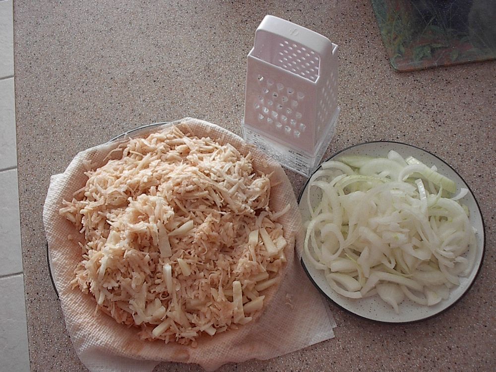 做法:土豆洗净削皮,用擦丝器( grater )擦成丝,用纸巾( paper towel )裹住土豆丝吸干其中之水份,直到纸巾不会湿透。洋葱去皮切丝。