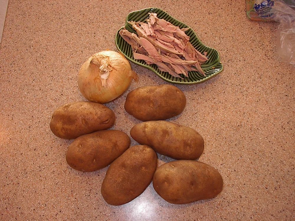 材料:土豆 6 只,洋葱1只(Vidalia Onion ),火鸡肉适量(实际用量比照片上多),植物油, 盐,黑胡椒粉适量。