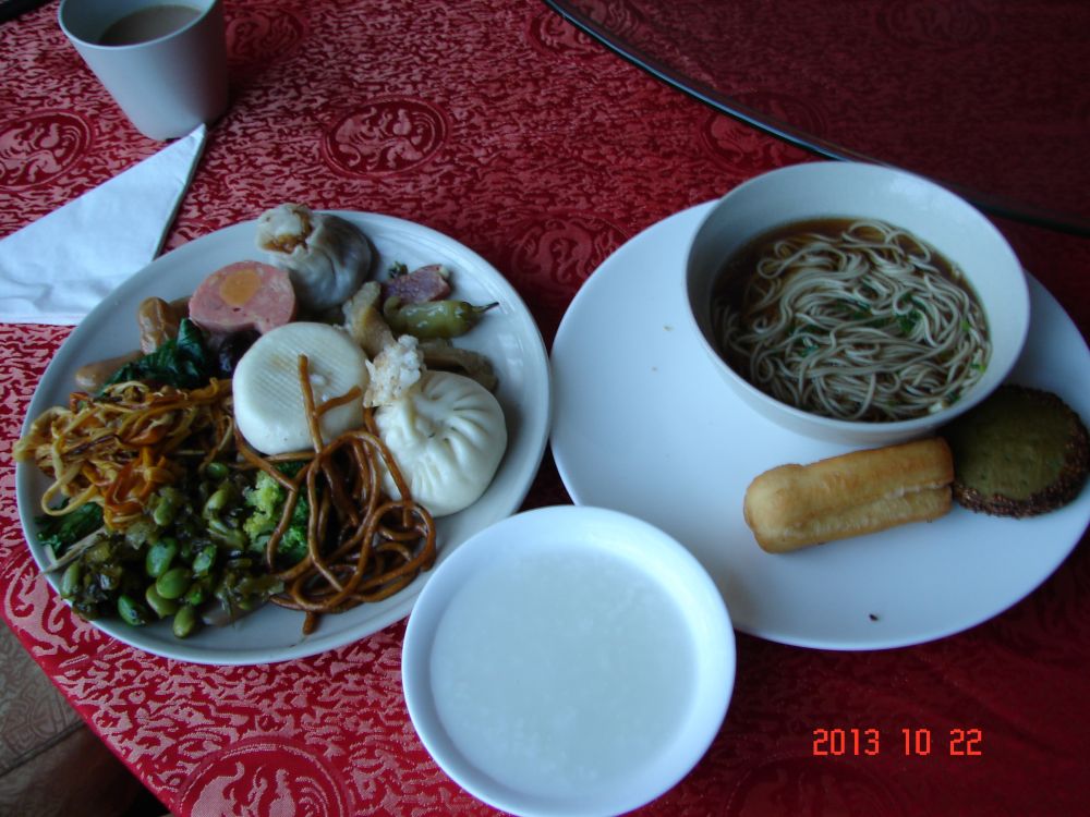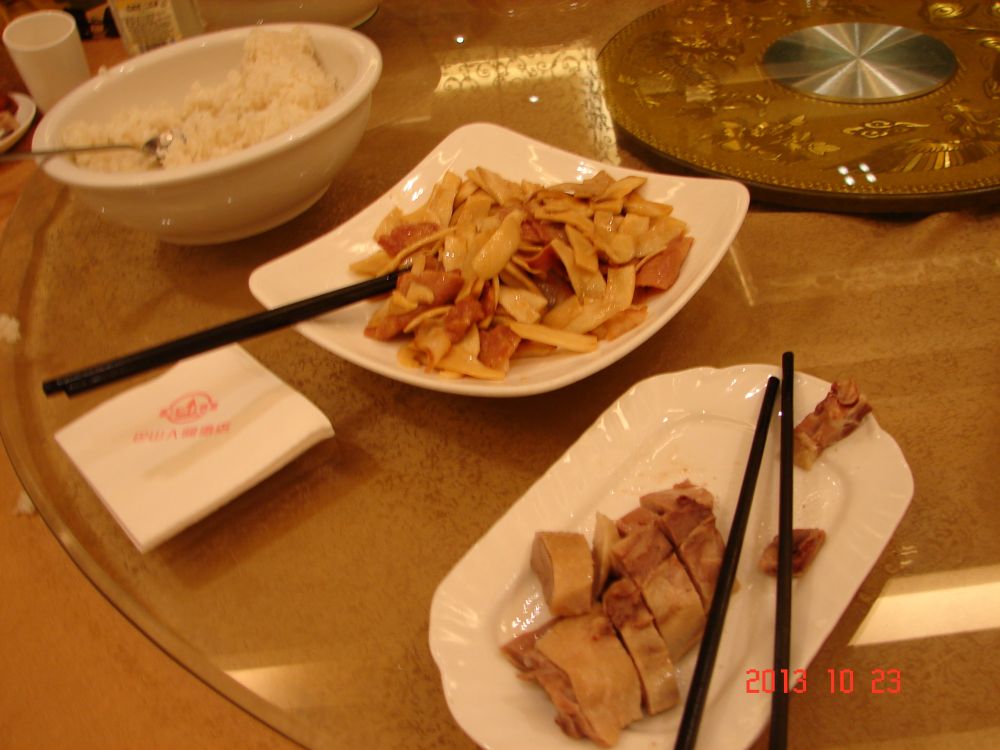 晚餐在巴山人间酒店享用。内容:盐水鸭,鱼,罗卜排骨汤,冬瓜烧鸡,面拖茄子,磨菇肉片,蛤蜊蒸蛋,炒卷心菜,窝头杂粮等。照片是抢拍的,很难拍全,怕妨碍别人。