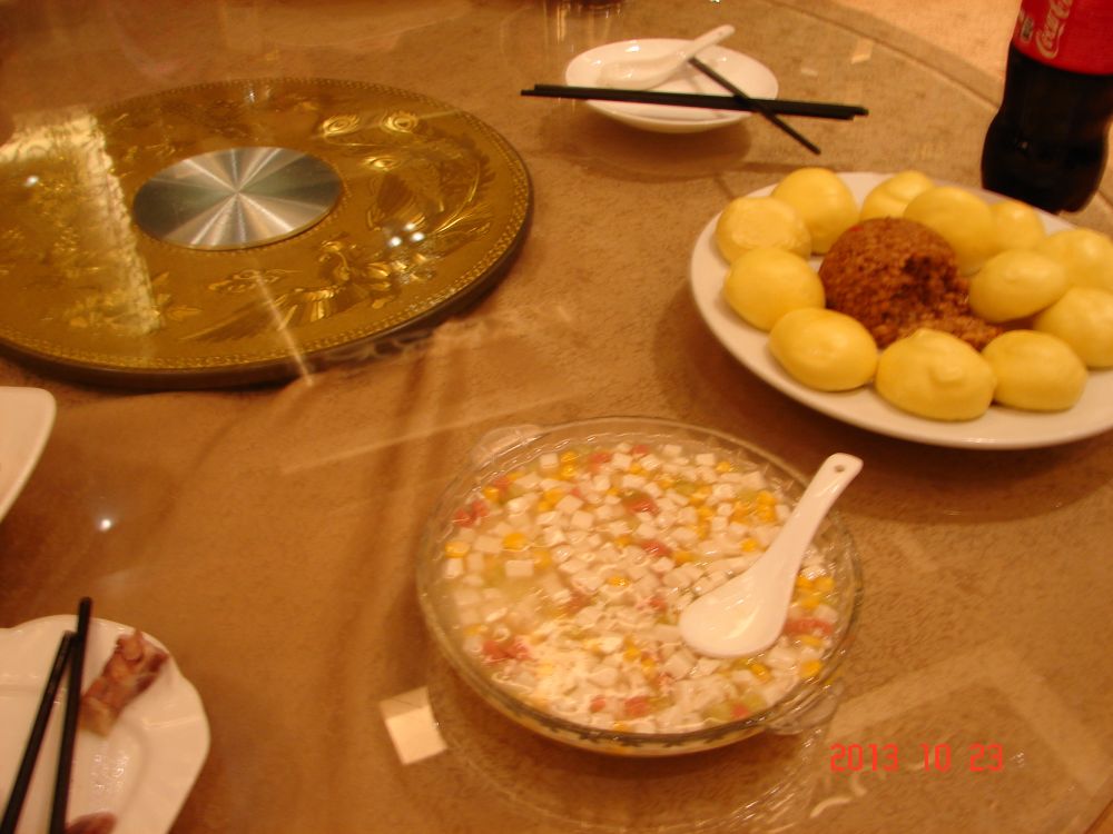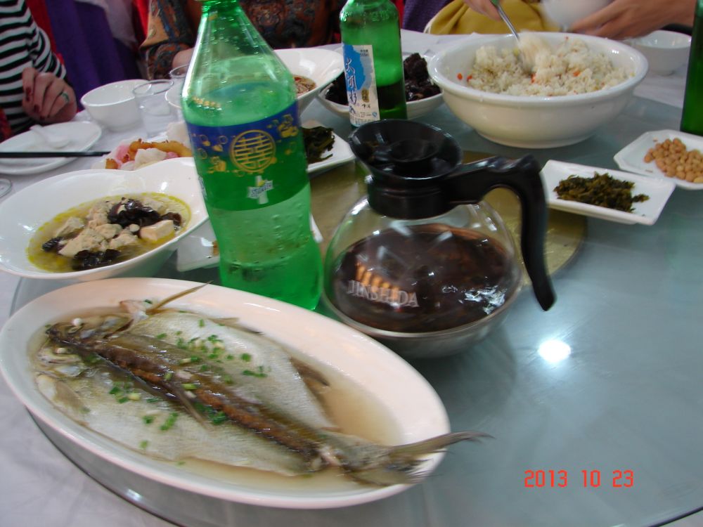 午餐回圆润居享用,有无锡小排骨,清蒸白鱼,油爆白虾,豆芽炒肉丝,青椒肉片,炒卷心菜,豆腐木耳,龙蝦片,炸鸡条,咸菜罗卜干,酱黄豆,凉拌海带,炒饭,佛跳墙。