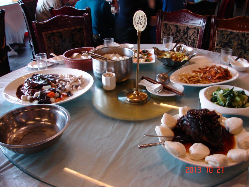 午餐在梅家坞六号花园餐厅享用。安导游特别关照我们,用餐前要用热水清洗一下碗筷。在后来的行程中,我们牢记安导游的嘱咐,除了早餐,餐前都在桌上先洗碗,没有热水就用茶水,我入乡随俗很快见怪不怪,D却百思不得其解。午餐的内容大致有:红烧蹄胖,鱼,汽锅鸡,猪耳,鱿鱼,青菜,玉米排骨汤。。。我包里背着刀叉,D就是不搞特殊,说在中国就要和大家一样用筷子。可是吃饭的节奏很快,形势逼人,怎一双筷子了得!D大有长进,昨日尝鸭舌,今日试猪耳,令我刮目相看,不过鱼头鸡爪还是不碰,端坐着吃得文质彬彬,同桌的吃邻直夸他。我在一旁又是拍照又是夹菜又是帮他挑鱼骨,跟患了多动症似的。