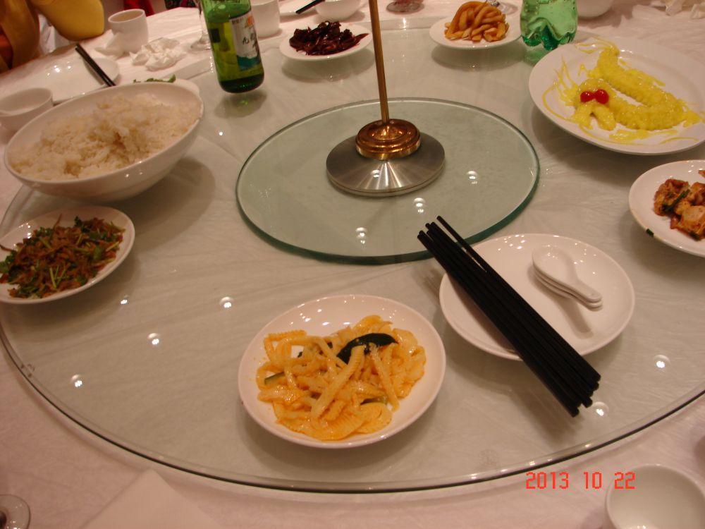 晚餐在无锡弘历皇朝酒店享用。一下子来了好几个还乡团,餐馆乱了阵脚,菜一下子上不来,清蒸白鱼左等不来右等不来。导游扬言要去抢了,还说春节时带一个还乡团到厨房抢菜。。。这回我要炊烟滚滚赞导游了,他真给我们“抢”来了一盆红烧鱼。晚餐的内容大致有:哈尔滨啤酒,无锡排骨,红烧鱼,蝦,鸭子,蒜味波菜,莴笋,酸豇豆,油面筋,咸鱼等。