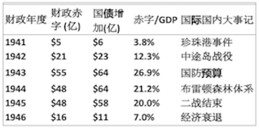 美国是在1941年日本偷袭珍珠港事件后正式参与第二次世界大战的。在1943年和1944年,美国在欧洲和太平洋的两个战场,对德国和日本的战争都是处于白热化阶段,美国政府的财政赤字和当年的GDP比率都达到了令人惊讶的64%。