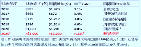 针对新冠疫情抛出“2万亿的紧急援助计划”,将使美国财政赤字在2020年创自第二次世界大战以来的历史最高。据资料,美国2019年的GDP增长率为3.6%,GDP总量达到21.7万亿。川普政府2019年的财政收入是3.45万亿美元,财政支出是4.45万亿,财政赤字为$9840亿,非常接近1万亿美元。2019年12月19日,美国联储的公开市场委员会(Federal Open Market Committee)预测, 2020年GDP增长率将下降到2%,GDP总量达到22.6万亿。没有想到的是,短短三个月后,新冠病毒对美国和世界经济的影响,美国2%GDP增长率会泡汤。算上政府的目前的