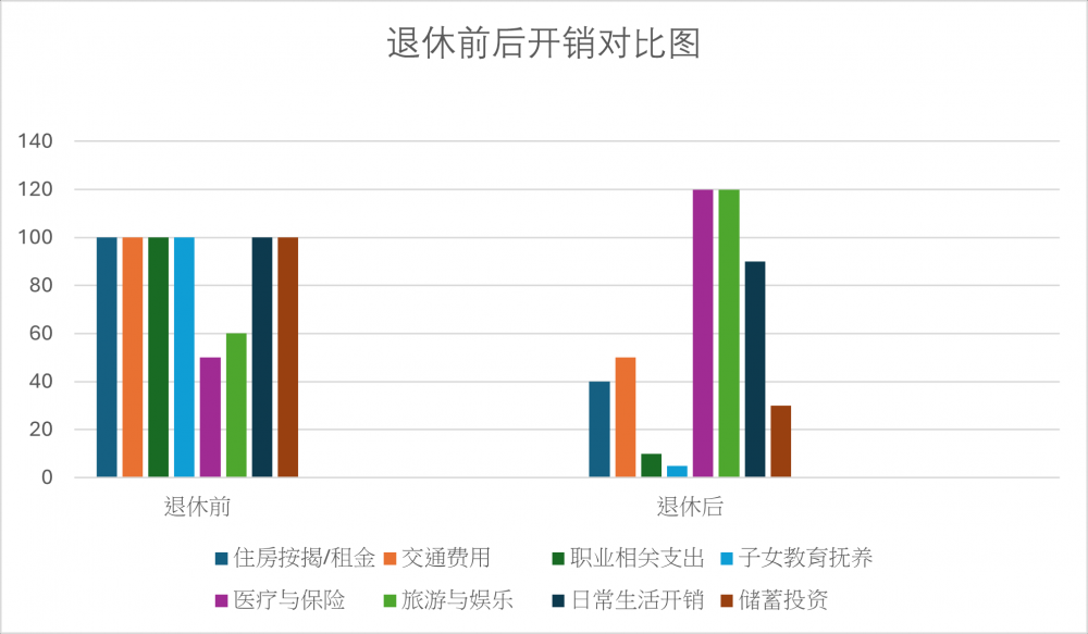 退休前与退休后的支出结构有明显不同。 以下列出一些常见的支出项目对比:
