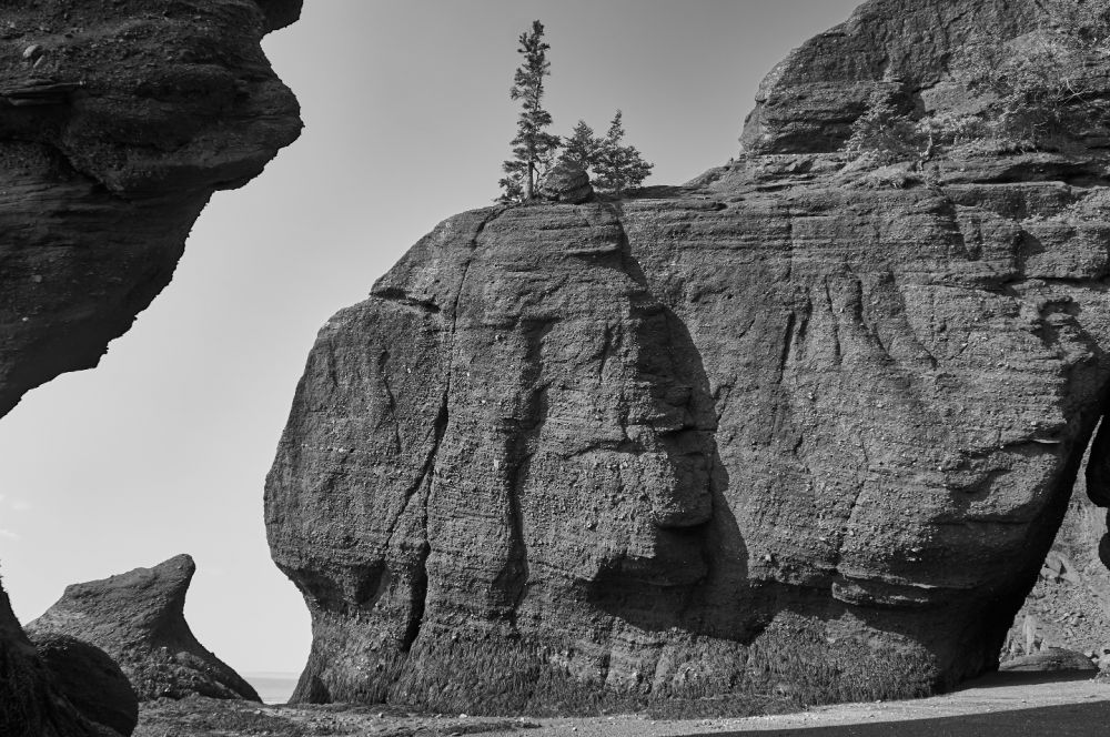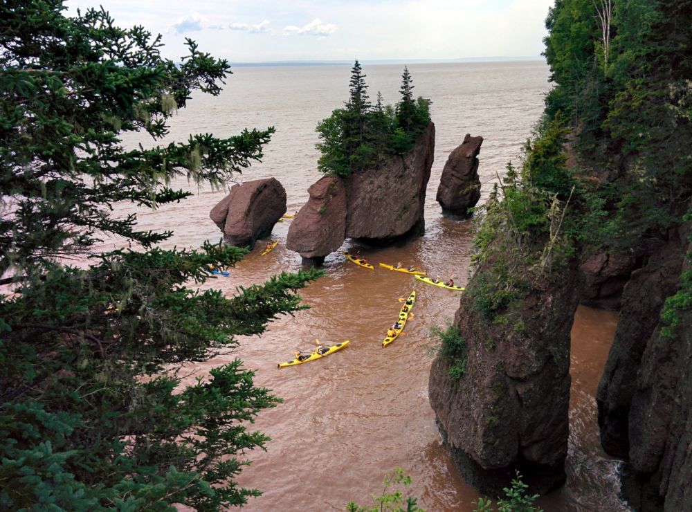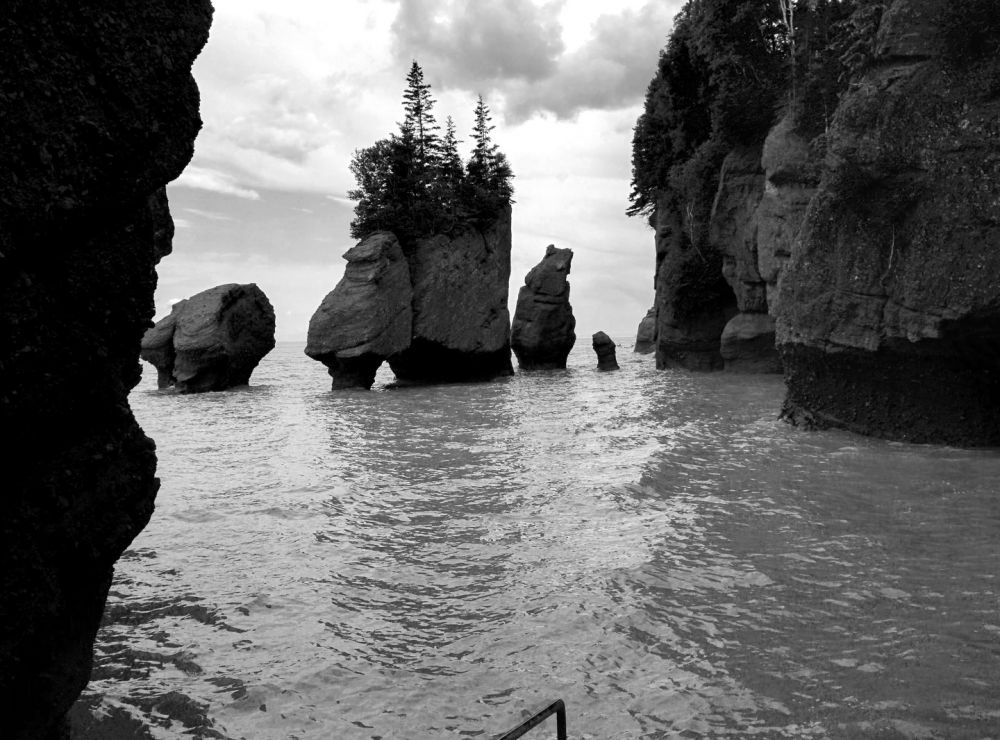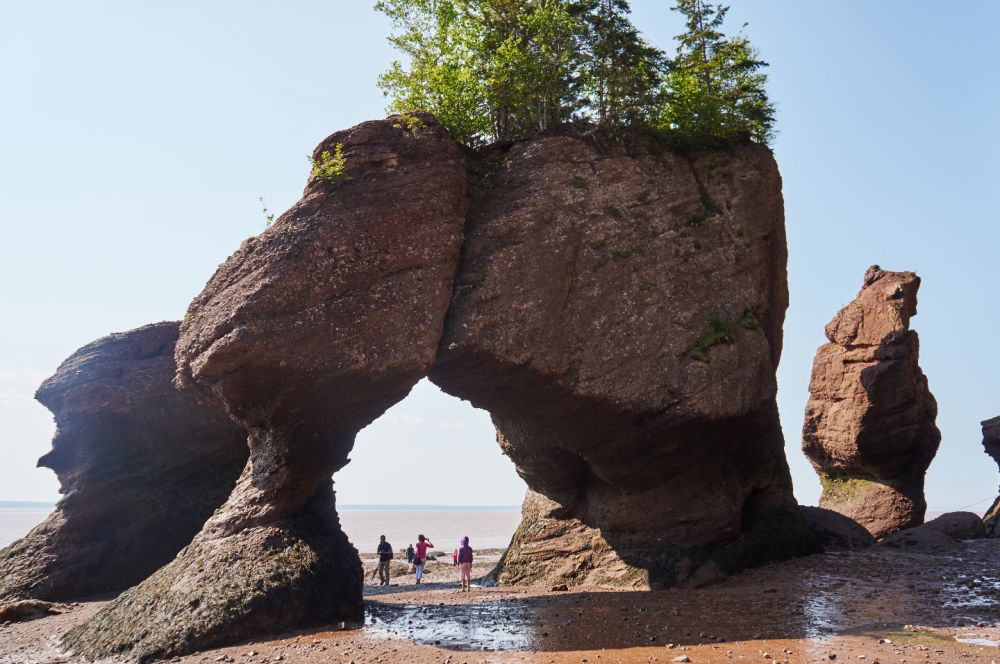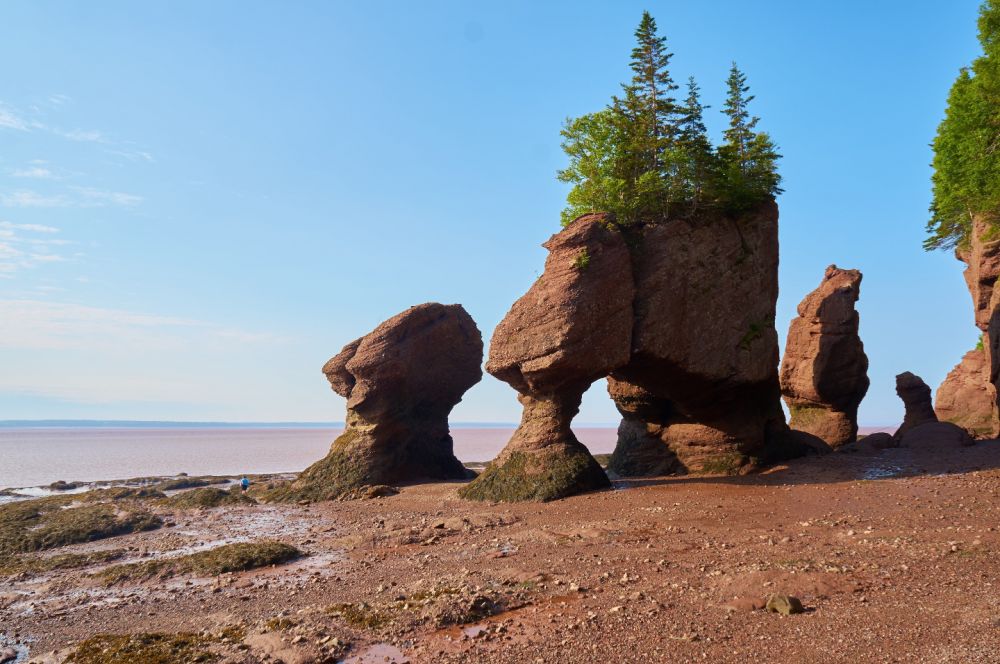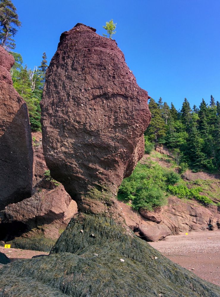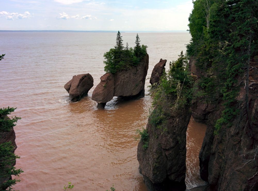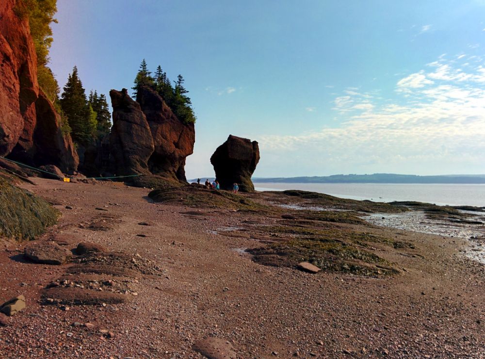 去蒙客屯的主要目的是游览芬迪湾(Bay of Fundy)的好望石(Hopewell Rocks)。芬迪湾位于新苏格兰省和牛逼省之间,涨潮时海水涌入海湾,除了向上,无处可走,于是这里就有世界上落差最大的海潮,最高落差达到16米,每一次涨落有1000亿吨的海水冲刷海岸,于是形成了一些海边奇石。海潮的涨落之间不多不少6小时,所以每天正好涨落四次,像钟表一样准确。去那里参观,一定要事先看好海潮时刻表,一方面可以看到低潮和高潮的区别,更要紧的是为了保住小命。