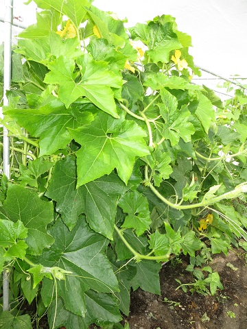 冬瓜也需要掐芽,这样结果多,果实大。这是两棵冬瓜,目前结了六个果。好像还在继续结。