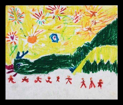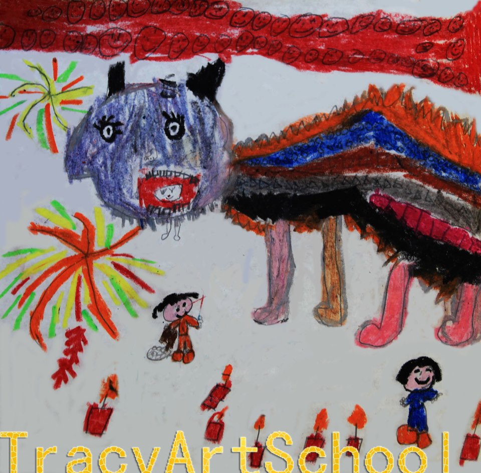 这张5岁小朋友作品和上张画是同一个主题,但表现的却迥然不同。他表现的元宵节节日气氛,灿烂而浓烈。小作者选了黄色和绿色协调色,用色大胆,明快,构图简洁大方。画面下部用了些小面积的红色人群来增加节日感觉。这幅画颇有大师风范。同样主题,上张作者感兴趣是狮子而这张小作者感兴趣的是那绚烂无比的烟花,这些烟花还会化成大鸟,飞下来[