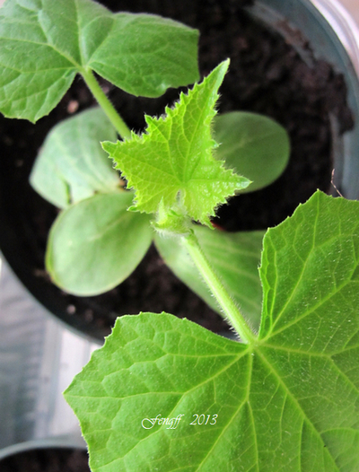 下面也是一棵黄瓜苗,但仔细看它有两对子叶,是一棵黄瓜嫁接苗。去年试验没成功, 今年试的3棵都成活了。黄瓜嫁接苗是用南瓜做砧木嫁接而成,简单说就是苗的底部为南瓜,上部为黄瓜。从资料上得知黄瓜嫁接技术在大棚种植中已运用得很成熟了,它的优点是: