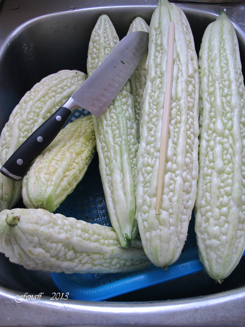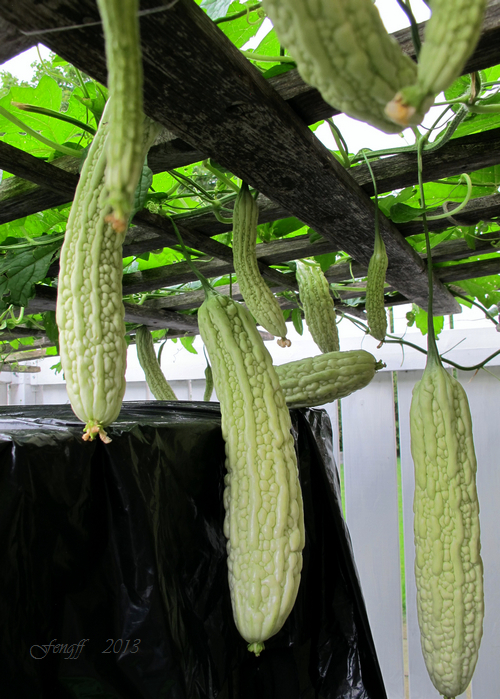 45 苦瓜. 找了个角落种下一棵苦瓜苗,原房主留下的架子终于派上用场。今天数了下,这棵苗目前共结了17条瓜,这个角度只能照到13条。