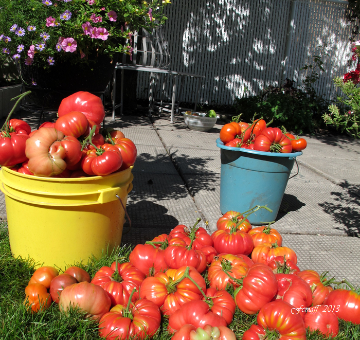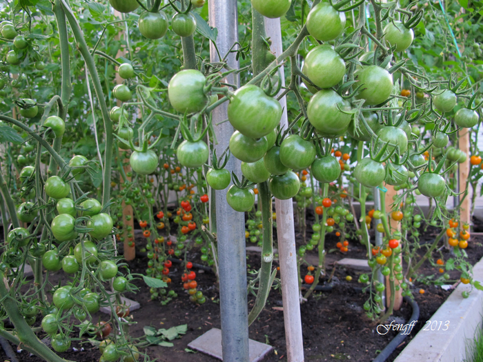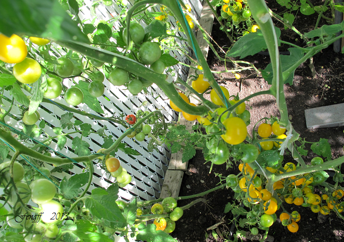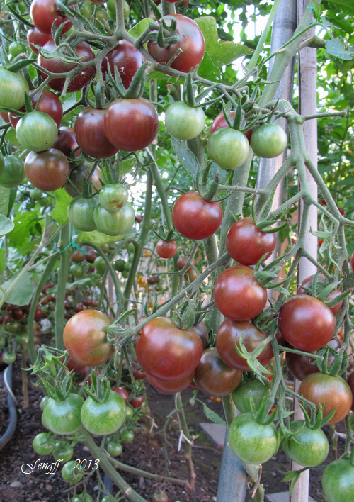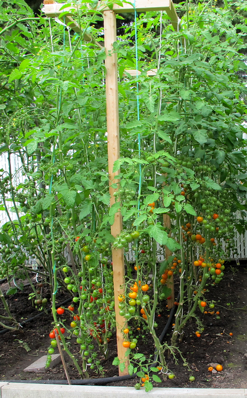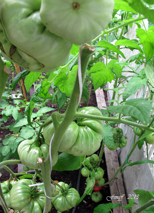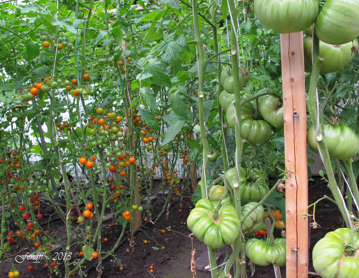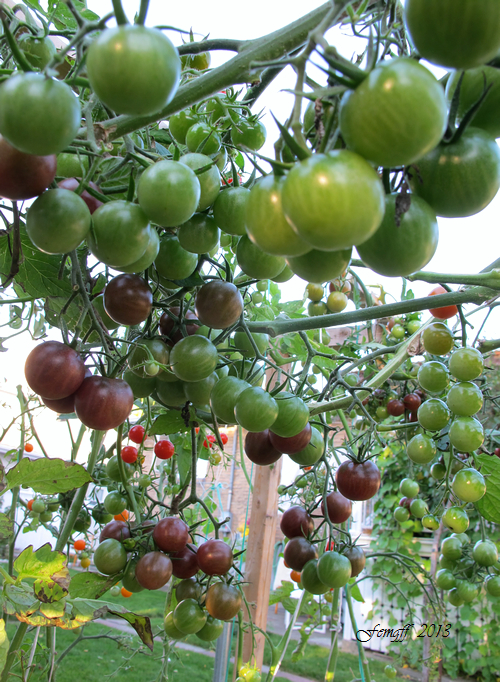 46 西红柿. 今年夏天有亲朋好友来玩,都喜欢吃西红柿,所以种得多些。今年种西红柿搭了丁字形架子,用绳子把西红柿植株向上绕使它们都向上生长,节省地方,在上足了肥的前提下合理密植。今年种西红柿只用了去年一半的地,但比去年还多种了20棵。