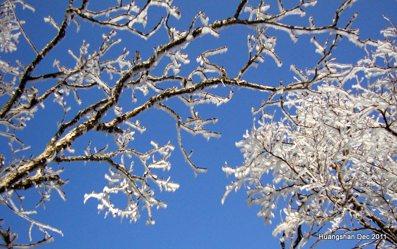 缆车到玉屏峰站下,要开始自己爬了。这附近有迎客松,人太多,熙熙攘攘的热闹无趣。一路爬了莲花峰,鳌鱼峰,白步云梯和鳌鱼洞。到莲花峰的时候开始有见到薄雪。接下来穿过北海宾馆爬光明顶的时候就感觉到累了。但是这个时候景色开始有突变,雪和挂冰越来越多。一高兴,也就不觉得累。 光明顶下来到白鹅山庄,雪越来越多,真是漂亮。同时人也越来越少,除了遇到的挑山工,游人已经不多见了。