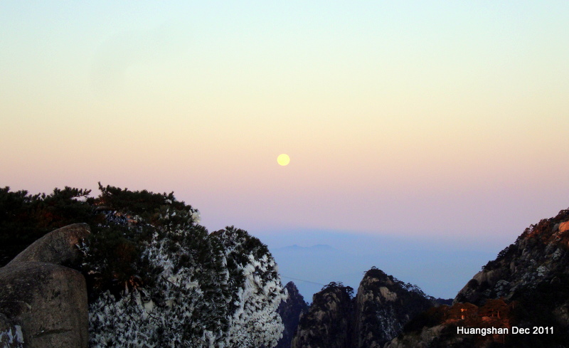 日出预计在6:40,早上5点开始往外走。昨晚全蚀过的月亮已经完全恢复过来,冷冷清清的挂在天上,抬头看,隔着层叠的挂着冰花的树枝。突然想,如果抬头对着月亮狼叫几声,会不会引出 jacob the wolf.这么一想,也就不害怕了。呼哧呼哧爬到山顶,竟然已经有三个疯狂的摄影发烧友支好三角架占据了最好的地盘。是可忍而孰不可忍,好在都比较客气,我挤一挤在旁边也就座下了。三人中,有个四川口音的,有个台湾普通话口音的,还有个老广口音的。有得聊天,时间也不是那么难熬。看日出最激动最好看的时候其实就是等待和序幕。等霸道的太阳一跃而出,也不过就是曲终人散的开始。