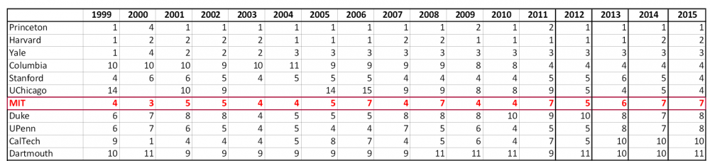 Other schools, Northwestern, Cornell, Brown and Washington U made into the (tied) top 10 once or twice in the history of the rankings.