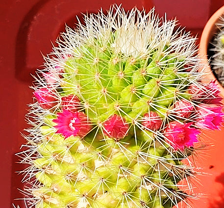 我和我的女儿一同成长了一年以后,我女儿也出落成大姑娘了,今年我和我的女儿一同开花了,我对我女儿说:“ 孩子,我们能在小叶妈妈家落户是很幸运的事情,你还小,要尽量保持清纯的模样,小叶妈妈已经有了经验,她不会再给你换大盆了,这样,你会一直保持这样的体态,而且,小叶妈妈也不会让你暴晒了,看,我不小心晒出斑来了,不过,小叶妈妈会再给我做手术的,孩子,我们把心里的那团火迸发出来吧,让我们仙人球的球生,也轰轰烈烈一把,看,小叶妈妈给我们做了视频,我们母女俩都上镜头了,还有我们心中的那团火,也留下了动人倩影。