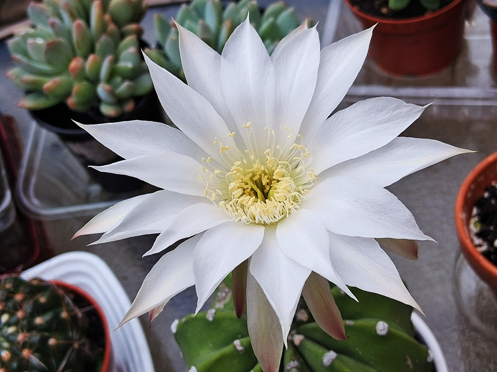这是今年的最后一朵仙人球花了。这个仙人球买来以后,每年都开花,在整个夏季是花开不断。其他的一些仙人球,在夏天也开了花,但有一些是在春天开花的,就是五六月份开花的。
