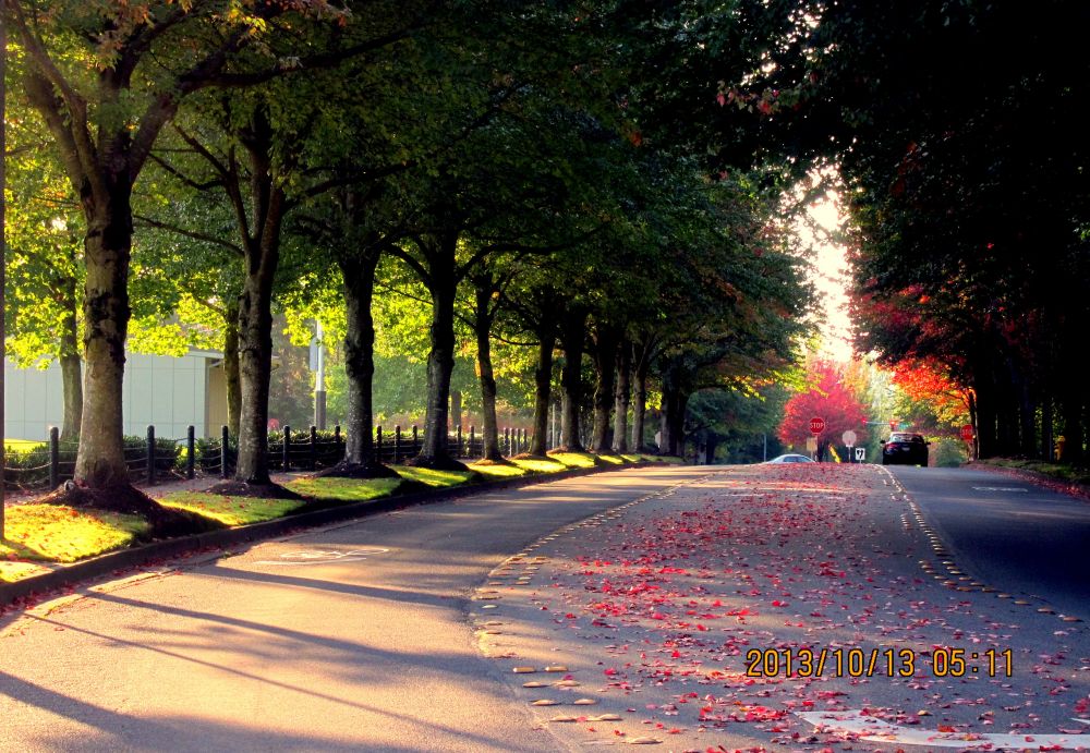 这一条圆弧形的车行道,侧逆光恰到好处地从树筛中筛落开来,将远远近近的树枝桠挑染成深深浅浅的绿,把满地的缤纷落红也撒上了一层金粉。弯道终点是几簇燃烧的火红,更平添了一种摄魂夺魄的美。我一见没车辆驶过,急忙窜下人行道,抢拍了这张——