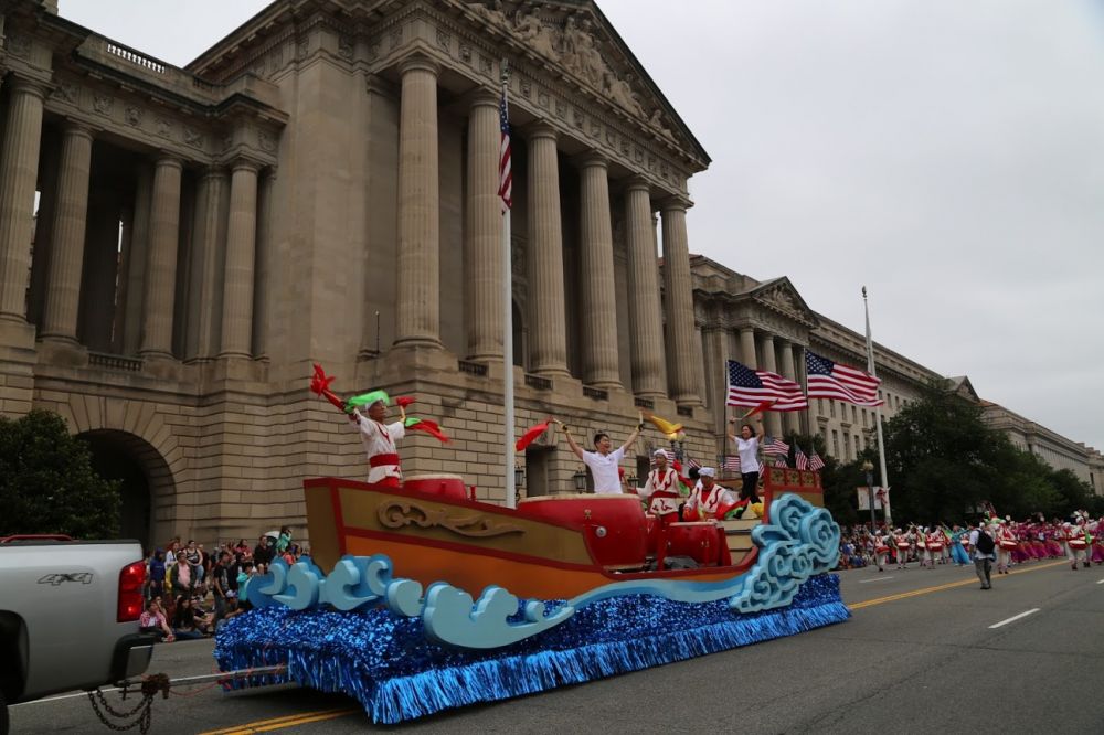 7月4日独立日清晨,天空中阴云密布。但是这丝毫没有影响参加游行队伍的华裔民众的热情。一大早,负责安装花车、后勤的工作人员,就来到集结地区,麻利儿地把花车搭建起来。”华人联盟“的花车以郑和下西洋的宝船设计为蓝本,两侧的前面装饰以朵朵浪花翻卷层层碧浪,后面是层层云水推出朵朵祥云。花车上置一面直径两米的威风大鼓和三个直径一米的威风中鼓,四周插满飘扬的美国国旗。随后,参加游行的来自华盛顿特区,维吉尼亚和马里兰的近百名侨胞及一些华人的美国亲属。陆续来到现场,代表大华府地区众多的华人社团,一起欢庆美国的独立日。参加者中年纪最小的14岁,最年长的已近8旬。