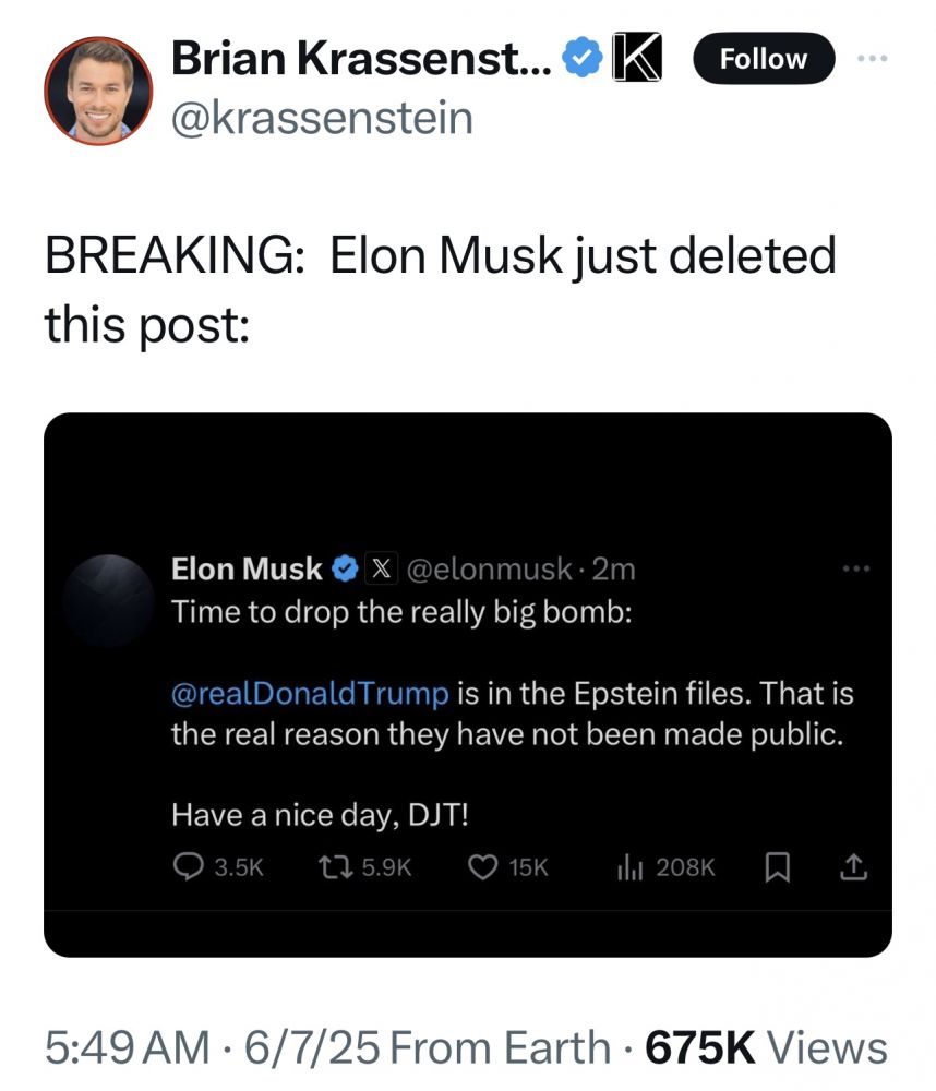你是个Tech Savvy, 所以喜欢Elon,似乎是马斯克先dropped了Trump与Epstein 的Really big bomb的,这当然是Personal, 并且拒绝给出证据,难道他的红卫兵发现了什么?