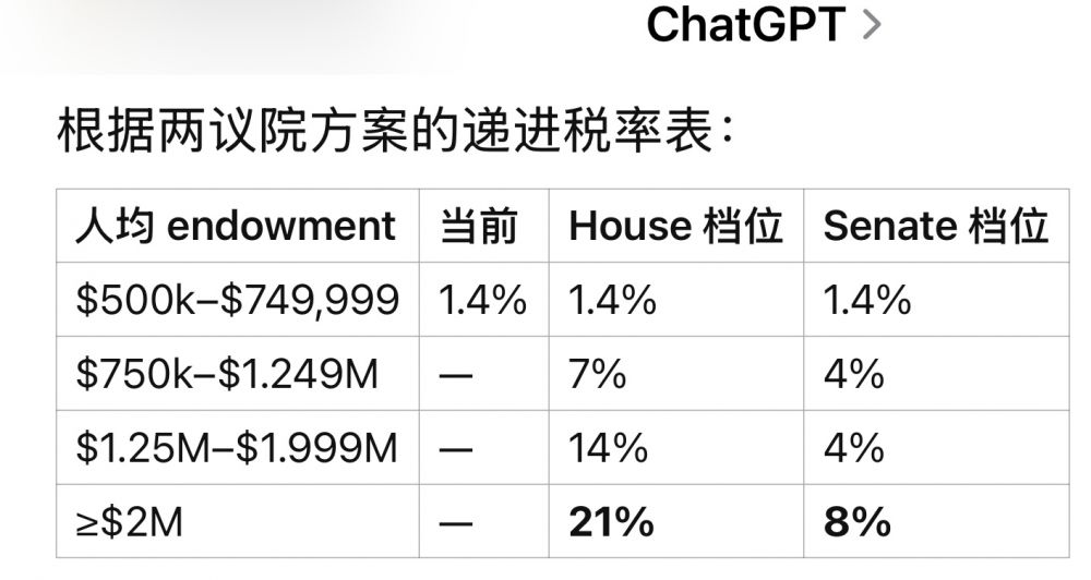 这是大而美法案对美国大学捐捐赠基金税的影响概况,首先从统一税率改为分级税率。以前的制度是对私立大学的捐赠基金净投资收入征收统一的1.4% 消耗税,前提是每位学生的捐赠基金规模必须超过 $500,000($500K)。