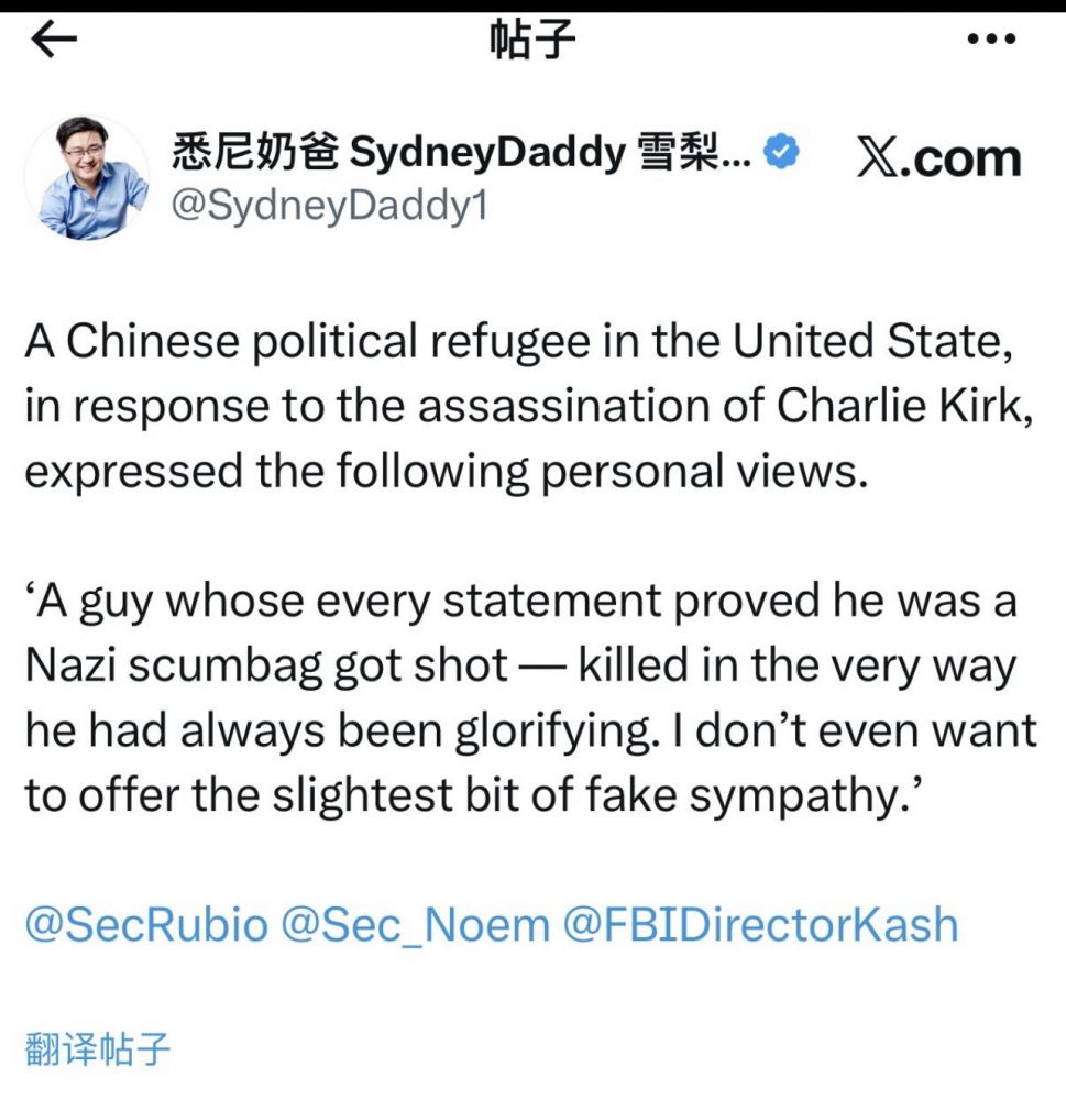 告密文化在中国文革时盛行,儿子可以告父亲,夫妻更是相互揭发,我们在美国和西方世界不希望这种落后文化的输出。悉尼奶爸这属于公开的揭发,因为他将二大爷的话翻译成英文后,也抄送给美国国务卿卢比奥,国土安全部长Kristi Noem以及FBI局长Patel, 言下之意是希望美国启动调查。