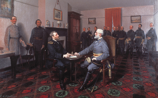 描写美国内战的南北双方在投降仪式里的油画。在美国人民心中白胡子的南方失败将军 Robert Lee也是英雄,这些油画里他的气势比胜方将军Grant还盛。南方士兵只要放下武器就能自由归田,没有报复措施,Robert Lee最后的五年是现在的Washington and Lee University的校长。我们要知道美国南北战争仍然是美国至今为止的所有战争中死亡人数最多的,还是兄弟之间的残杀。战争以这样的方式结束就是为了抚慰南方战士和人民的心,林肯的开阔胸襟让我们习惯了胜者为王败者为寇的中国人甚为难堪。