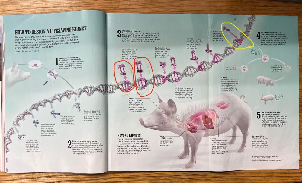 在这篇示意图里,左边是他们踢除的“坏基因”,右边则是导入到猪肾里的人抗免疫排斥的基因,阿肯森将CD46和CD55用铅笔划圈,我替他用红圈加强了。