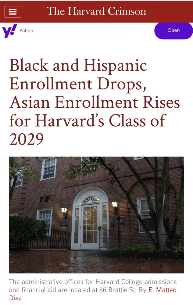 这反映出哈佛在平权行动被最高法院判违宪后,仍然在微妙地维持黑人学生比例,以避免触发校内外的政治正确的舆论反弹。哈佛校报惯用政治正确的标签,题目就是黑人与拉丁裔的降低。